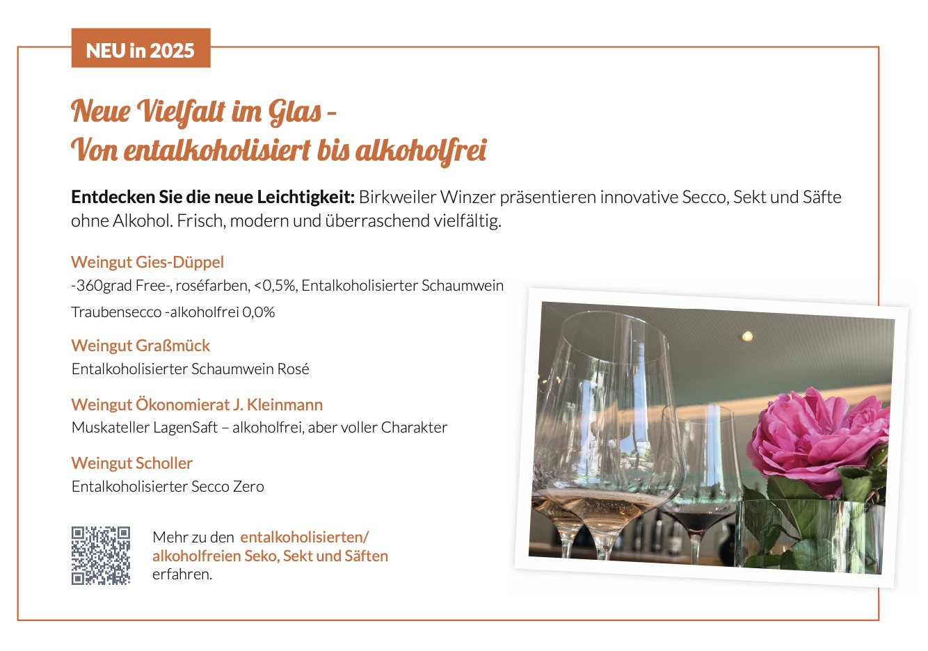 Entdecken Sie die neue Leichtigkeit: Birkweiler Winzer präsentieren innovative Weine und Seccos ohne Alkohol bzw. entalkoholisiert. Frisch, modern und überraschend vielfältig  Details zur neue Vielfalt im Glas Der Birkweiler Weinherbst 2025 bringt nicht nur die großen Lagenweine ins Glas, sondern überrascht mit einer Premiere: Zum ersten Mal stellen die Birkweiler Winzer auch ein eigenes Angebot […]